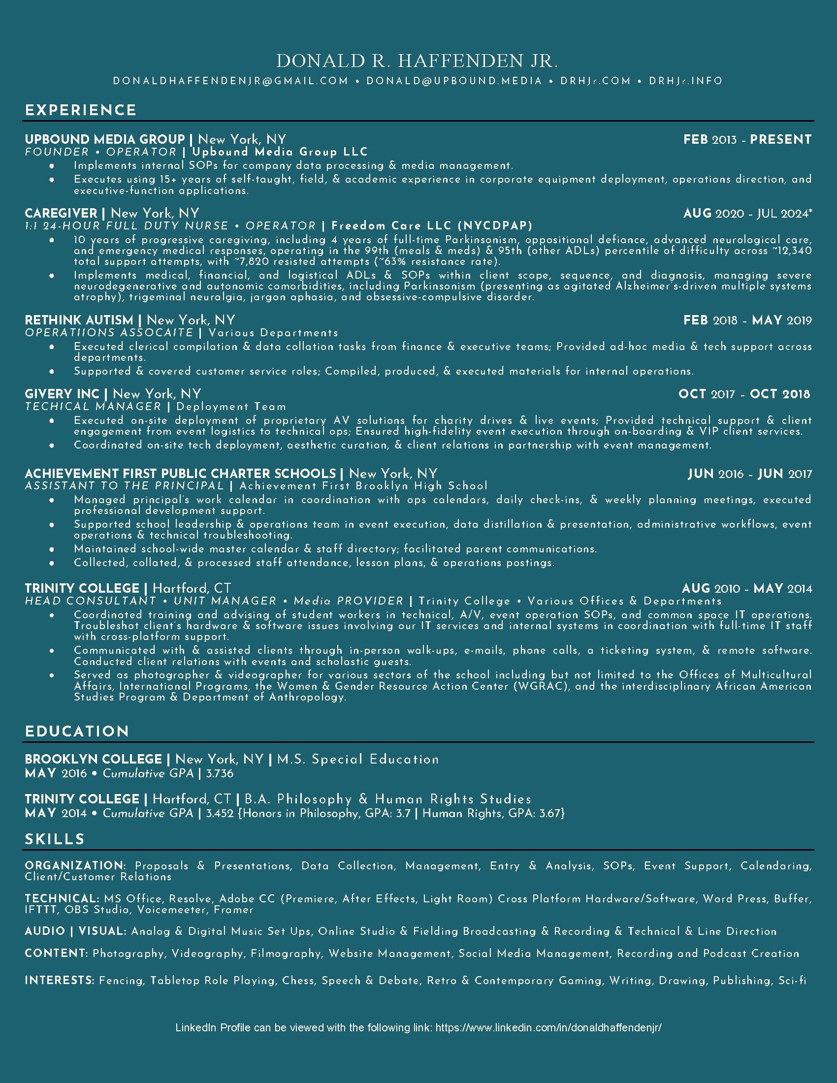 Upbound Media Group LLC • (UpMG) • is a media services company of my founding in 2014. I am Donald, or Don, it’s founder and solo operator, I currently contract with Triple R Solutions effectuating technical and creative direction, bespoke consultation, and production projects in the Tri-State area.